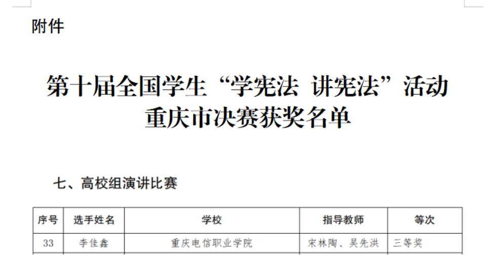 近日,重庆市教育委员会印发《关于第十届全国学生“学宪法 讲宪法”活动重庆市决赛获奖情况的通报》,我校教育与设计学院学生李佳鑫在演讲比赛中获三等奖。